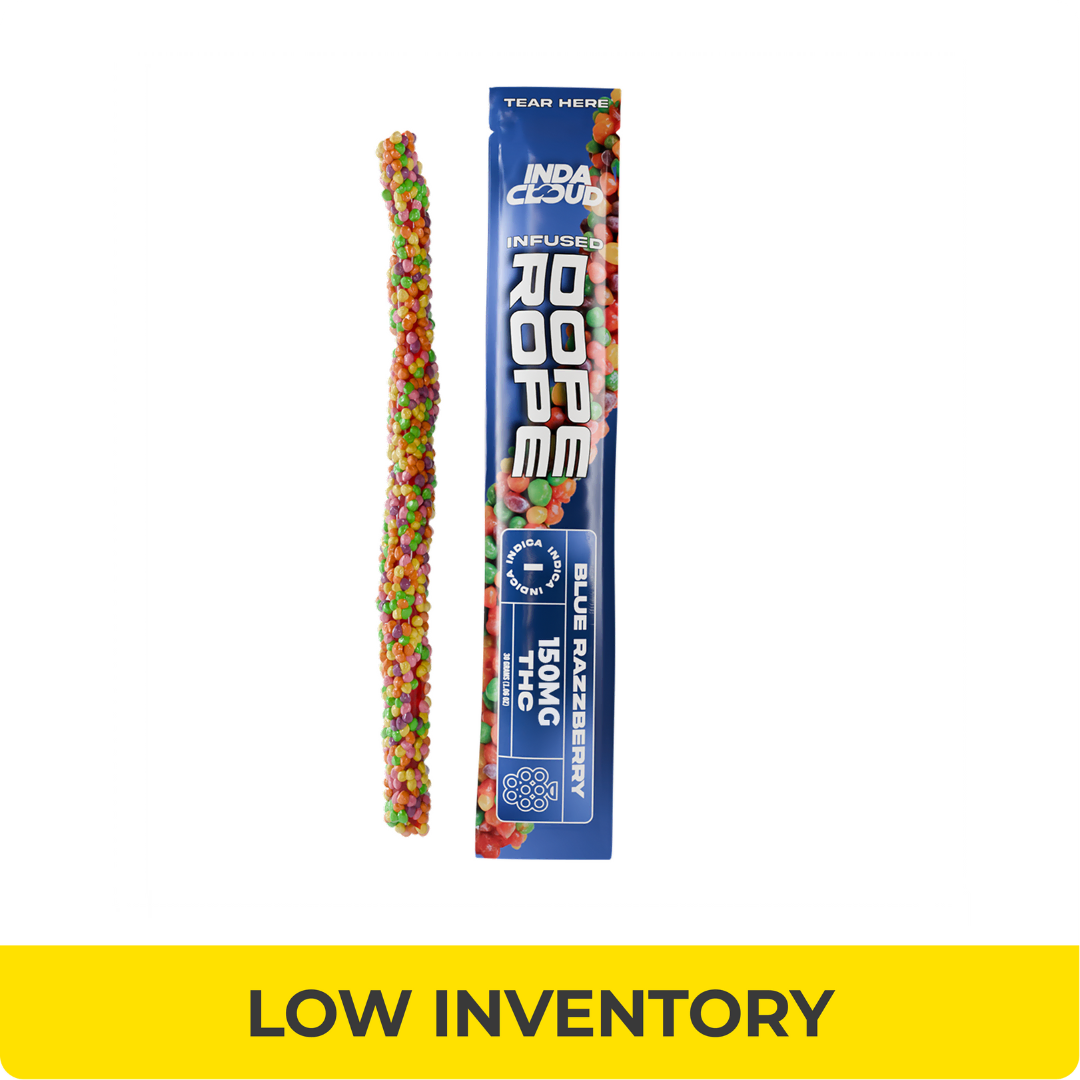 Introducing the Dope Rope, a blast from your past! This candy pebble covered treat boasts 150mg of Delta 9 and Delta 8 THC. Crafted in three flavors, Fruit Punch, Strawberry Colada, and Blue razz, it’s the perfect edible to get you absolutely baked. Be sure to dose accordingly, 150 mg makes the Dope Rope our strongest edible yet so we recommend you start with pieces no larger than ⅛