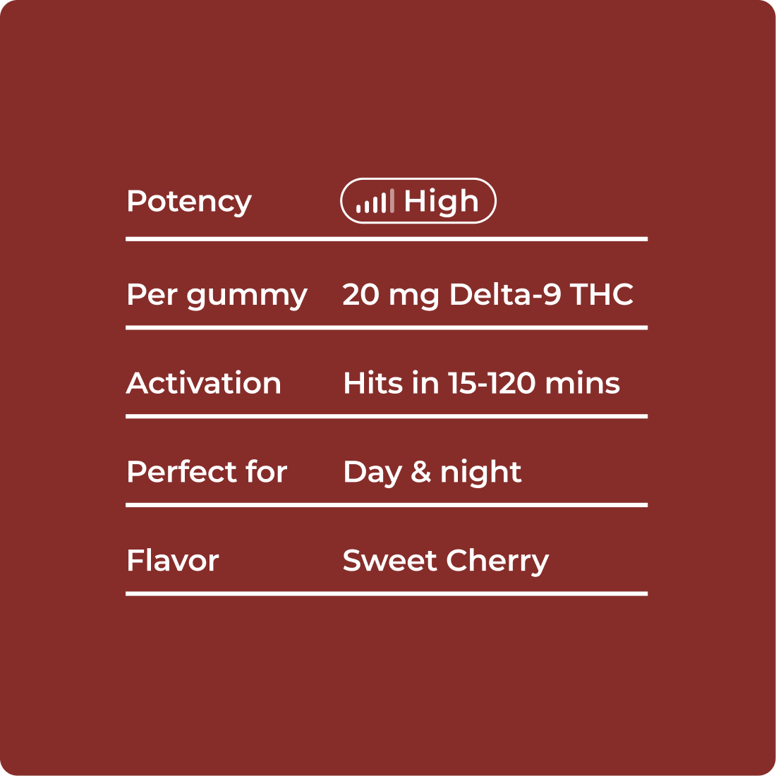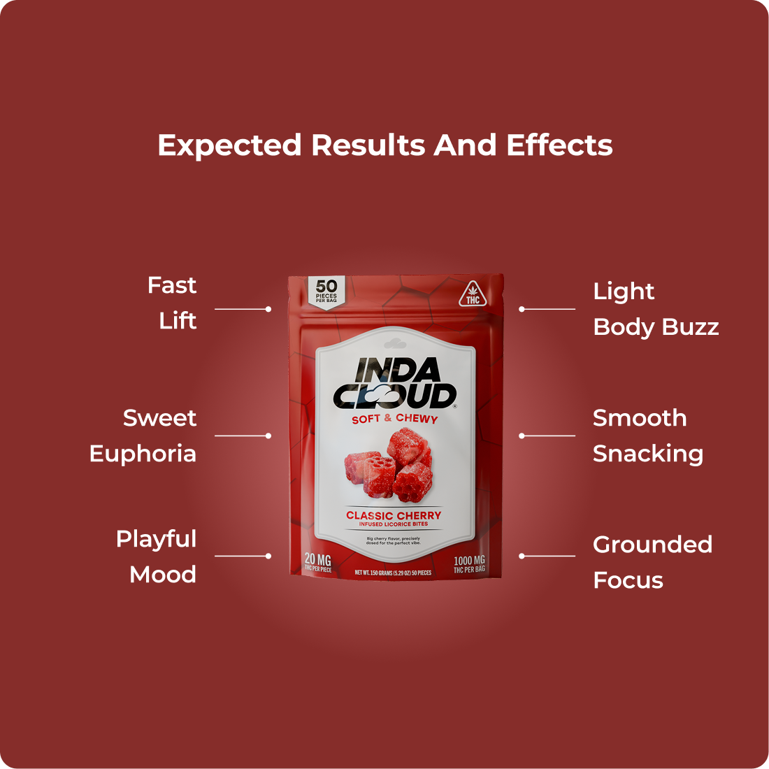 Bold cherry meets classic licorice in bite size form. Potent, chewy, and nostalgic with a full-body buzz that lasts.