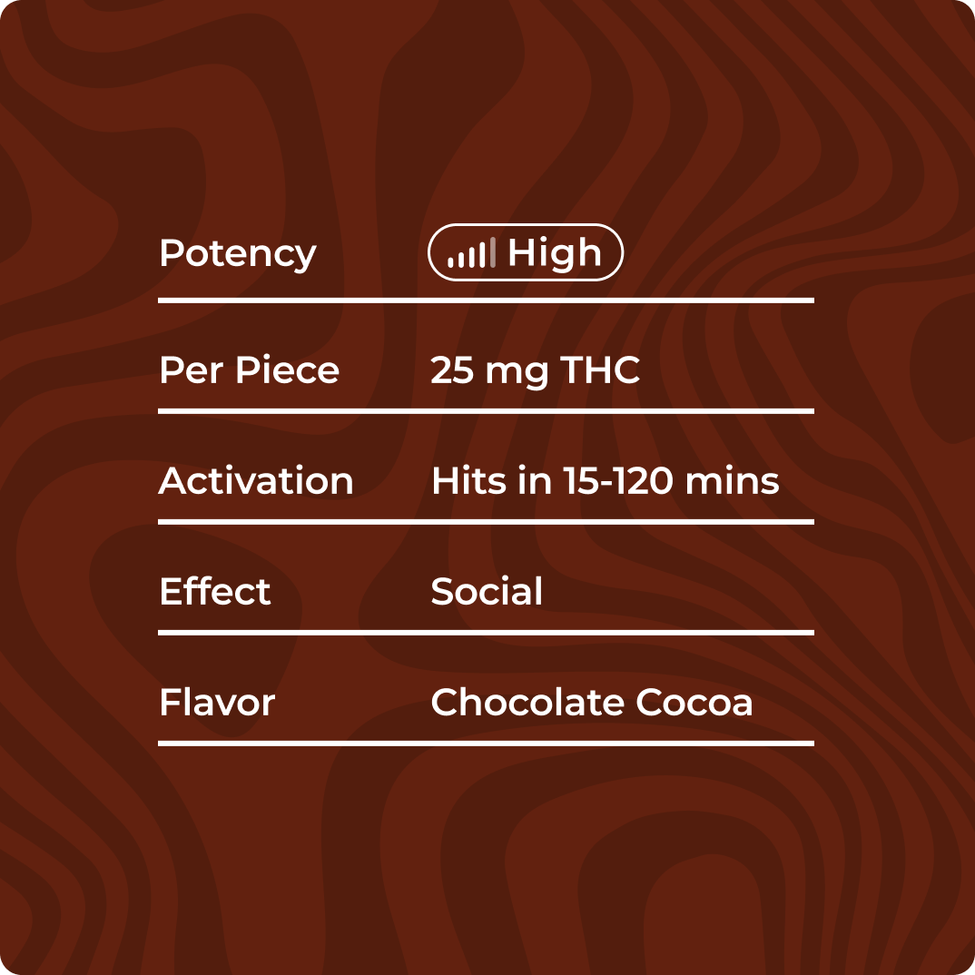 Rich cocoa cereal clusters fused with fluffy marshmallow sweetness and a THC boost. These crunchy, chocolatey squares deliver nostalgic flavor and perfectly balanced effects in every bite-sized piece.