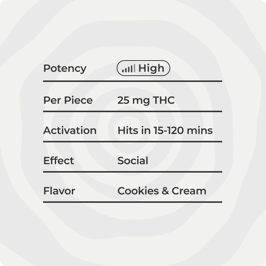 Crisp cookies & cream bites with an infused twist, a decadent delight that layers deep cocoa, velvety vanilla, and mellow effects in every precisely crafted piece.